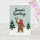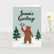This digital illustration shows a cute brown bear with a red scarf, holding antlers in a snowy forest. The bear is in the center with two green trees covered in snow. At the top, it says "Season's Greetings" with snowflakes falling. The colors are soft and calm, making it cozy and joyful. The bear looks playful and invites us to join in the holiday fun. It feels like a warm hug from winter 🎅🏼🎄🎁. This card is perfect for spreading holiday cheer and making people smile.