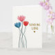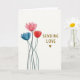 This beautiful card is painted with delicate watercolors, giving it a warm and loving feel. Three artistic flowers take center stage, softly lit from the lower-left corner. Their petals blend shades of pink, coral, and teal, creating a dreamy, gentle look. Below, thin green and gray stems twist gracefully, adding a natural, flowing touch.