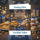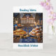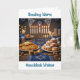 Happy Hanukkah card with sweet holiday blessings of Sending warm Hanukkah wishes with illustrations of the menorah, potato pancakes and jelly doughnuts. Inside is a dreidel and gold coins.