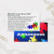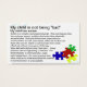 Carte de taille professionnelle avec quelques informations de base sur ASD "L'autisme est un trouble neurologique complexe..."Ces caprices peuvent être effrayants à voir. L'enfant tente de communiquer......" Reverse de la carte a l'image de pièces de puzzle tomber contre un arrière - plan bleu rétroéclairé. Ces cartes peuvent être utiles lorsqu'un parent tente de gérer le comportement de l'enfant et que des gawkers se réunissent et/ou commentent.