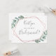 Cette carte super mignonne est la façon parfaite de demander "tu seras ma demoiselle d'honneur ?". Le design se compose d'un cadre géométrique rose chic en feuille d'or avec une formulation typographique branchée et une végétation luxuriante d'eucalyptus à l'aquarelle. Ces cartes sont faciles à customiser et peuvent être utilisées pour demander à vos proches d'être votre demoiselle d'honneur, votre servante ou votre chef d'honneur, une fille de fleurs, etc.