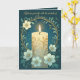 A tall Sham candle glows with a steady golden flame, its wax adorned with delicate filigree. Encircled by pale blue blossoms and curling vines, the composition blends warmth, elegance, and a serene, almost celestial atmosphere, evoking light, joy, and contemplation.