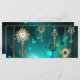 Or, clés antiques avec engrenages et cadrans accrochés sur chaînes dorées sur arrière - plan vert lumineux.