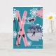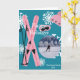 Skis roses, chapeau et lunettes avec des flocons de neige sur une belle carte de vacances bleue. Parfait pour Noël.