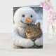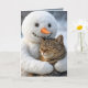 Un bonhomme de neige avec un nez de carotte tient un chat de table heureux sur un fond enneigé, où le chat a les yeux fermés, apparemment profiter de l'étreinte au milieu de flocons de neige tombants. Le texte intérieur peut être modifié.