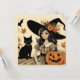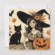 Apportez un peu de charme envoûtant à votre saison effrayante avec cette carte de vœux carrée de 13,3 cm x 13,3 cm, dotée d'une illustration rétro d'une charmante sorcière portant un chapeau pointu classique. Avec une main gracieuse posée sur une citrouille-lanterne lumineuse, elle regarde calmement, sa présence sereine parfaitement équilibrée par son fidèle compagnon, un chat noir assis à côté d'elle. En arrière-plan, des chauves-souris volent dans un ciel automnal orageux tandis que le feuillage d'automne tourbillonne doucement dans la scène, complétant un tableau intemporel d'Halloween qui se sent à la fois magique et nostalgique. Le design capture l'essence de l'art vintage d'Halloween, avec des couleurs douces et riches et un style rappelant les illustrations