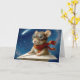 Une charmante souris portant des lunettes et une écharpe rouge arpente un avion en papier à travers un ciel étoilé tandis qu'une comète brillante illumine la scène, ajoutant à l'atmosphère fantaisiste. Le texte intérieur peut être modifié.