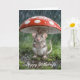 Mignonne souris sous un champignon à pois rouge et blanc sous la pluie. Tout le texte peut être modifié.
