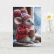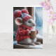 Une souris mignonne portant un pull rouge et un chapeau assorti est assise près d'une fenêtre givrée, tenant une tasse de chocolat chaud et regardant un paysage enneigé à l'extérieur