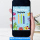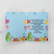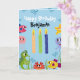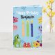 Cette carte de voeux présente un style graphique fantaisiste et ludique, parfait pour célébrer les anniversaires sous les vagues. Les personnages sont rendus de manière charmante, caricaturale, avec de grands yeux et des expressions amicales. Les illustrations de la vie marine comprennent une étoile de mer souriante, une pieuvre, un crabe, une méduse, deux poissons aux rayures colorées et des motifs, et un hippocampe. Ces adorables créatures apportent une touche de joie à la conception. Trois bougies de différentes hauteurs et des couleurs vives ornent le centre, chacune agrémentée de motifs uniques. Le texte à l'avant et à l'intérieur de la carte est entièrement personnalisable.