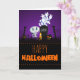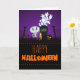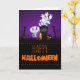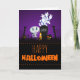 Une carte de voeux heureuse de Halloween. Une conception mignonne déplaisante de Halloween d'amusement éffrayant. Placez dans un cimetière foncé et effrayant. Une pierre tombale indique la DÉCHIRURE, avec une bougie et quelques crânes rougeoyants au sol. Une vieille barrière grinçante se penche au côté. Un squelette de sourire adorable ondule et un certain cool regardant des fantômes tourbillonnent autour dans le ciel. Placez sur un arrière - plan noir et pourpre de gradient.