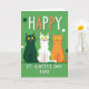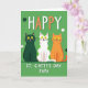 This greeting card shows three stylized cats posed close together on a rich emerald green background, giving the scene a cozy St. Patrick’s Day feel 💚. One cat is deep forest green, another is white with lime spots, and the third is an orange tabby, and their bodies lean in as if they’re sharing a friendly secret. All three have wide yellow eyes and tiny pink tongues that add a teasing, affectionate look between them. Above the cats, the word “HAPPY” sits near the top in slightly textured letters, mostly white with one orange “P” that stands out. Small shamrocks are sprinkled around the heading like confetti, adding a festive touch ☘️. Below the trio, the line “ST. CATTY’S DAY PAPA” is placed as the main message, centered under their faces. The cats’ bright eyes and rounded shapes pop against the green field, with the shamrocks floating around the top text.
