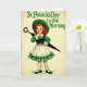 This card shows a vintage-style St. Patrick’s Day scene with a cherubic young girl posed as if she’s sharing a secret with a close friend. Her red corkscrew curls spill from under a wide emerald hat, and her bright blue eyes glance upward while one finger rests gently at her chin, giving her a tender, teasing look. She wears a green long-sleeved top with a black bodice, and a crisp white apron with ruffles along the hem drapes over a green checkered skirt. White lace trims her collar and cuffs, softening the outfit the way a careful touch softens a familiar hug. Behind her, a closed black umbrella leans diagonally, its dark shape cutting across the pale background like a quiet companion waiting nearby. Near the top, the phrase “St. Patrick’s Day in the Morning” appears in verdant green lettering, centered above her head, adding a festive note 💚☘️. The backdrop is a creamy beige with a lightly aged texture, and the umbrella handle curves upward beside her shoulder.