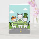 This card shows three white cats with black ears and tails standing together on a gray road marked with short yellow dashes, like they’ve paused for a friendly photo on St. Patrick’s Day 💚. Behind them, a bright green lawn stretches into a calm blue sky with a few puffy white clouds, giving the scene an easy, sunny feel. The left cat wears an orange cone-shaped hat, leaning slightly toward the others as if trying to stay close. In the middle, the cat’s green bow tie draws your eye, and its gentle smile and rosy cheeks suggest a sweet, affectionate bond with its companions. On the right, the cat sports a tall green leprechaun hat with a golden buckle, standing a touch taller like the proud organizer of the moment ☘️. Across their paws are three green signboards that read “Happy St. Patrick’s Day,” with “Happy” on the left, “St. Patrick’s” in the center, and “Day” on the right in lighter lettering. Small golden-yellow shamrocks decorate the “Happy” and “Day” signs, and the hats and accessories pop against the simple sky-and-grass background.