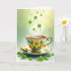 The front design shows a white porcelain teacup and scalloped saucer decorated with yellow sunflowers and deep green leaves, edged with thin gold rims and a curved gold handle. Inside the cup, amber tea glows with a light curl of steam, like a quiet invitation to linger with someone close 💚. A small gold spoon rests neatly on the saucer, angled as if it was just set down between two friends mid-conversation. Behind it all, the background fades from deep sage green to a lighter yellow-green, giving the scene a morning-lit glow. Bright green shamrocks float above the cup and drift across the foreground, their stems and shading making them look almost touchable ☘️. The overall palette mixes greens, golds, and sunny yellow in a gentle way that suggests an easy closeness, like shared tea and unspoken affection. There’s no printed wording, leaving open space around the cup while shamrocks hover in the air and scatter near the bottom edge, with the gold accents catching the light.