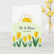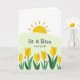 This design shows a pale green hillside topped by a bright golden half-sun with thin rays reaching into a white sky, like the start of a new morning. Centered on the hill, the words “He is Risen” appear in flowing cursive-style lettering, with “ALLELUIA!” set just below in a simpler, all-caps style. The text is dark and easy to read against the soft green, standing close together like two lines meant to be read as one message. Along the bottom edge, a row of upright yellow spring flowers with green stems leans gently toward one another, giving the scene a friendly, close-knit feel 🌷. Each flower has slightly darker shading on the petals, adding a soft sense of depth while keeping the shapes simple. Tiny red star-like marks are sprinkled between the flowers, like small accents that echo little shared glances in a crowd 🐇. The lower foreground is filled with these yellow blooms and green leaves, dotted with the small red accents beneath the centered lettering.