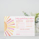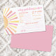 Cette carte horizontale prédictions et conseils pour bébés présente un design lumineux et joyeux sur le thème du soleil. Sur le côté gauche, un grand soleil avec des rayons vibrants dans des tons classiques de jaune, orange et rouge ajoute une touche chaleureuse et ludique. Sur la droite, les invitations de la carte doivent remplir leurs meilleures devis pour l’arrivée du bébé, y compris la date, l’heure, le poids, la couleur des yeux, la couleur des cheveux, et à qui ressemblera le bébé. En bas, il y a un espace où les clients peuvent partager un petit conseil pour les parents à venir et signer leur nom, ce qui en fait un doux saké après la douche. Le dos est doté d'un arrière - plan rose doux, mais vous pouvez le changer en n'importe quelle couleur pour correspondre à votre thème de baby shower. Entièrement personnalisable, cette carte est une activité ludique et réfléchie qui ajoute une touche personnelle à votre célébration.