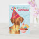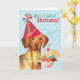 Bonne fête d'anniversaire avec ce design mignon avec un Vizsla mignonette, portant un casquette de fête avec un soleil de crème glacée. Le texte peut être facilement changé; il suffit de cliquer sur le bouton personnaliser.