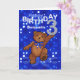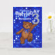 Un mignon petit ours en peluche brun dansant à travers les lumières bleues et tenant un numéro 3 scintillant est un plaisir de 3ème anniversaire saluant ce petit garçon spécial dans votre vie avec son nom sur le devant de la carte. Personnalisez le nom sur le verset avant et intérieur en utilisant les modèles fournis. Design original par Anura Design Studio.