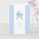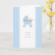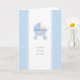 "Si petit, si mignon, si malodorant" - si vrai ! Un message amusant en dessous de l'illustration graphique originale d'un mignon petit garçon regardant de son chariot bleu pastel fait une adorable carte bébé d'accueil pour les nouveaux parents d'un bébé doux garçon.