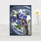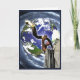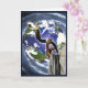 Carte du Nouvel An ; personne en tallit soufflant un shofar sur un fond de la terre et galaxie tourbillonnante.