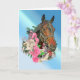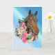 Une tête de cheval bai est encadrée par un fer à cheval et des roses roses et blanches sur fond bleu sur cette carte d'anniversaire. Parfait pour tout cavalier !