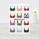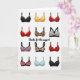 This greeting card features nine illustrated bras arranged in a neat 3×3 grid on a bright white background. Each bra has a different style and color, making the design fun and easy to take in. There’s a black bra with white scalloped trim, a bold golden-yellow push-up style, a leopard-print design, and a red bra decorated with small white hearts for a romantic touch. The illustrations have soft shading that gives each bra a slightly rounded look. Centered in the middle of the grid is the message “thanks for the support,” written in casual, handwritten-style lettering. The clever wording ties the whole design together and adds a light, affectionate tone. This card is a fun and thoughtful way to show appreciation, affection, or Valentine’s Day love to someone special.