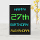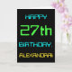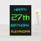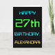 Ce design simple et amusant de carte de voeux d'anniversaire comporte un message comme "HAPPY 27th BIRTHDAY, ALEXANDRA!". Son look s'inspire du domaine de l'informatique numérique. Le nom à l'avant et le message à l'intérieur peuvent être personnalisés. Il pourrait être envoyé ou donné à quelqu'un qui célèbre son vingt-septième anniversaire et qui travaille (ou a travaillé avant la retraite) comme administrateur de base de données, programmeur informatique, administrateur réseau, développeur logiciel, ingénieur électrique ou qui aime utiliser des ordinateurs. [~Z0000100]