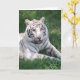 Un tigre blanc aux yeux bleus contre une belle herbe verte est assis dans cette photo de portrait vertical de tigre. Idéal pour les amateurs de tigres !