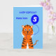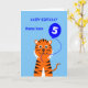 Personnalisez le devant avec le nom de l'enfant d'anniversaire. Personnalisez l'intérieur avec votre propre salutation spéciale (ou vous pouvez utiliser le texte fourni : "Avoir un 5ème anniversaire merveilleux, plein de plaisir et de surprises"). Le design comprend un tigre souriant avec un ballon d'anniversaire bleu sur un arrière - plan bleu clair. Il y a un autre ballon d'anniversaire à l'intérieur.