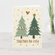 This adorable Christmas greeting card is a must-have for spreading holiday cheer! 🎅🏼 The main design boasts two lovable Christmas trees, one light green and one dark green, with beaming smiles on their faces. 🎄 A golden heart hovers between them, symbolizing enduring love. The playful pun "TOGETHER FIR-EVER" is elegantly written below in a cozy brown font, adding a touch of warmth to the design. The light background and floating golden dots create a festive and inviting setting for your message of love and commitment. 🎁 Perfect for your boyfriend, girlfriend, husband, or wife, this card is sure to bring a smile to their face this holiday season.