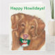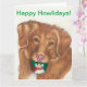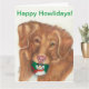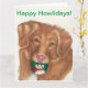 Carte de vacances d'un néo-écossais de canard à tambour tenant un ornement de Noël. Tous les produits bénéficient de l'effort de Toller Secourt Inc pour soutenir les Tollers Ukrainiens et leur peuple.