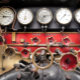 Les conducteurs de train à vapeur ont une vue depuis la plaque de marche des jauges et des commandes du train.