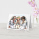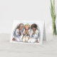 Sur le devant de la carte de Noël, une belle scène dépeint trois petits anges de couleur qui se réunissent dans la prière. Les trois anges ont des ailes délicates et plumées qui s'étirent derrière eux. Les anges sont placés au centre de la scène, les mains serrées les unes contre les autres et les yeux fermés dans la prière solennelle. Les trois anges ailés sont ornés de robes blanches qui sont de simples vêtements de terre. Malgré leurs différences d'apparence, les trois anges partagent une expression de dévotion et de piété sereines.