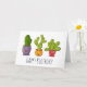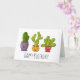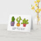 Carte d'anniversaire avec une illustration fantaisiste représentant 3 petits cactus heureux assis dans leurs pots de fleurs. Ils ont chacun leurs propres expressions uniques, souriantes et jolies.