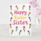 This card features a centered greeting that reads “Happy Easter Sister,” with “Happy” and “Sister” in candied pink brush lettering and “Easter” tucked between them in sunny yellow. The text sits on a white background, leaving plenty of open space so the words feel front and center. Around the message, small tulips form a light border, spaced out like little notes passed between close friends 🌷. The tulips alternate between warm red-orange and deep purple, each with a slim green stem reaching upward. Soft watercolor edges and slight paint variations give the flowers a gentle, affectionate look, like they were painted with someone special in mind. Bright, even lighting keeps the colors crisp while still letting the tender details show through 🐰. A few tulips appear near the corners, with others floating along the sides to frame the lettering.