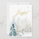 Scène de Noël élégante aquarelle feuillage forêt neige avec un pingouin adorable. Typographie script élégant en or "Joyeux" Aquarelle en verts et bleus.