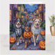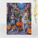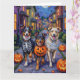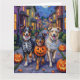 Les adorables bergers australiens habillés de costumes d'Halloween ludiques portent des seaux citrouilles tout en faisant des tours ou en traitant sous le ciel illuminé par la lune. Ce design festif met en valeur le manteau moelleux de la race, les yeux intelligents et la personnalité ludique, capturant parfaitement l'atmosphère éffrayante et amusante de la nuit d'Halloween. Une délicieuse célébration pour les amoureux de les chiens comme pour les amateurs d'Halloween.