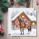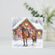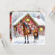 Une jolie carte de Noël avec l'illustration d'un cheval brun debout devant une magnifique grange rouge ornée de lumières de Noël et d'une couronne festive pendant une journée d'hiver enneigée. Vous pouvez ajouter un message personnalisé à l'arrière dans la zone de personnalisation.