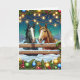 Jolie carte de Noël avec le graphisme de deux chevaux debout derrière une clôture de ranch en bois décoré de lumières de Noël. r. Ces chevaux sont faits dans un dessin animé de la bande dessinée style pop art. À l'intérieur de la carte a un cheval et un jeu de mots de Noël.