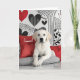 Carte de Saint-Valentin du Labrador jaune. Canine cousue contre un arrière - plan contemporain en rouge, noir et blanc. Pas de fleurs, juste des coeurs et des sacs de tendresse. L'intérieur est laissé vide pour votre propre message. Le texte à l'avant est modifiable, tout comme le texte et le logo à l'arrière de la carte.