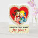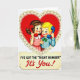 This greeting card shows a sweet mid-century style drawing of a boy and girl inside a large red heart. The girl has brown curly hair, rosy cheeks, and a pink dress, and she holds a red rotary phone receiver to her ear with a gentle, hopeful look. Next to her, a blond boy in a light blue shirt and a green bow tie holds a blue phone receiver and smiles with wide blue eyes. The heart has a cream and white stitched border that looks like lace, making the scene feel extra loving. The colors are bright and simple, with reds, pinks, blues, and touches of yellow that keep the focus on the couple and their call ❤️💌. Near the bottom, a cream banner reads “I’VE GOT THE ‘RIGHT NUMBER’” in black block letters, and just below it “It’s You!” appears in red script 🍫. It’s a cute, friendly way to say you’re thinking of someone special, so go ahead and share your Valentine’s Day feelings with someone you care about.