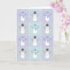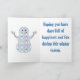 Four squares in pale blues and purples decorated with snowmen wearing top hats and winter clothing, like toboggans, scarves, and mittens. White stitching adds a decorative touch, giving the repeating pattern the appearance of a quilt, creating a perfectly cozy feeling for winter. The shape of a snowman creates a mask for the design to add a final seasonal touch to the inside and back of the card. Le texte de l'inside of the card can be change d to create a unique greeting of your own.