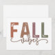 Cette conception de l'automne confortable et invitante présente la phrase « Fall Vibes » dans une combinaison de typographie audacieuse et élégante. Le mot « FALL » est affiché en grandes lettres carrées avec une texture en détresse, lui donnant une sensation rustique et vintage. Chaque lettre est remplie d'une couleur chaude et terreuse - des nuances d'orange, de brun, de violet et de vert atténuées - qui capturent parfaitement l'essence de l'automne. Sous le mot « FALL », le mot « vibes » est écrit dans un script délicat et fluide, ajoutant une touche d'élégance et de charme au design. Le contraste entre les lettres majuscules en gras et le script doux crée une composition équilibrée et visuellement attrayante, ce qui rend cette conception parfaite pour l'automne.