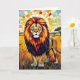 Carte d'anniversaire à thème Lion pour lui ou elle. Une belle illustration d'un lion dans un magnifique vitrail et un style de motif de carreaux cassés dans des couleurs terre comme le marron et le bleu.