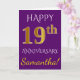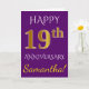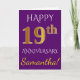 Cette carte de vœux simple et personnalisée pour un anniversaire de mariage présente le message "Joyeux 19ème anniversaire de mariage", avec le "19ème" ayant une apparence dorée. Le devant comporte également un nom personnalisé et un fond de couleur violette. L'intérieur contient un message de vœux d'anniversaire de mariage personnalisable. Elle peut être offerte à un mari ou à une femme pour célébrer le dix-neuvième anniversaire de mariage du couple. [~Z0000089]
