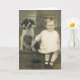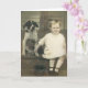 Écrivez votre propre message sur cette carte avec un enfant en bas âge se tenant sur la jambe du chien de famille