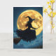 Une sorcière super cool devant une carte d'Halloween pleine lune avec une page de coloriage intérieur.