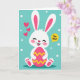 This card features a stylized white bunny 🐰 with long ears lined in soft pink and rosy cheeks, sitting with eyes gently closed and a small smile that feels like a sweet, shared moment. A tiny tongue peeks out as it cuddles a large oval egg in bright fuchsia, decorated with wavy yellow lines, as if offering it to someone special. To the right, a rounded yellow speech bubble carries the words “For you!” in darker lettering, placed near the bunny’s face like a quiet, friendly note. On the left side, three red hearts float upward, adding the look of affection between giver and receiver without needing any extra words. The background is a smooth aquamarine field sprinkled with small white dots, like confetti drifting through the air. The colors stay simple and high-contrast—white, pink, fuchsia, yellow, red, and teal—giving the scene a fresh, cheerful Easter feel 🌷. The bunny sits centered with the egg held close, while the speech bubble hovers to the right and the hearts cluster to the left against the dotted teal backdrop.