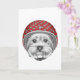 Ce dessin présente le portrait d'un Yorkshire Terrier portant un casque pointillé turquoise et rouge à pois.